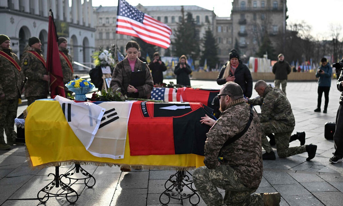 앞서 AFP통신은 우크라이나 키이우에서 태극기가 덮인 관 앞에 우크라이나 군인이 무릎 꿇은 모습을 담은 25일 자 사진을 보도하며 "전사한 한국인 의용군의 관에 장병들이 경의를 표하고 있다"고 설명했다.