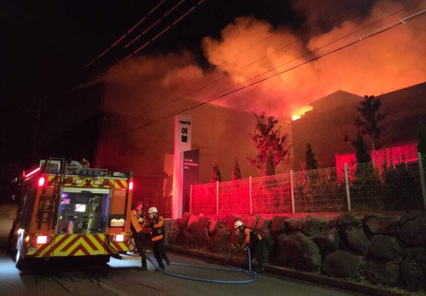 2일 제주도소방안전본부에 따르면 1일 오후 9시27분 서귀포시 토평동의 한 폐목재 가공업체 야적장에서 화재가 발생했다는 신고가 접수됐다. 서귀포소방서는 오후 9시39분부터 인원과 장비를 현장에 투입해 진압에 나섰지만, 불이 인근 공장 건물로 번졌다.
