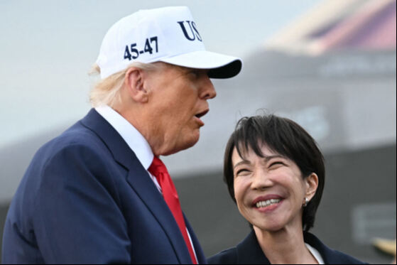 지난 10월 28일 일본을 방문한 도널드 트럼프 미국 대통령(왼쪽)이 다카이치 사나에 일본 총리와 함께 주일 미 해군 기지를 찾아 환한 표정으로 대화를 나누고 있다. AFP연합뉴스