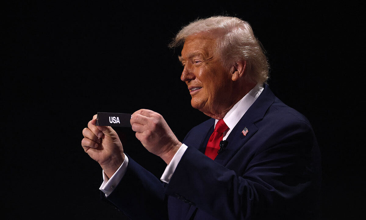 도널드 트럼프 미국 대통령이 5일(현지시간) 2026년 북중미 월드컵 조 추첨식 행사에서 공동 주최국 ‘미국’이 적힌 카드를 들어 보이고 있다. AFP연합뉴스