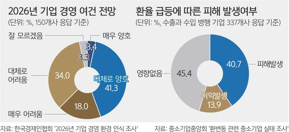 특히 진정 기미가 안 보이는 고환율은 다수 중소기업에 더 이상 기회 요인이 아니라 부담으로 작용하고 있다. 중소기업중앙회가 최근 중소기업 635곳을 대상으로 ‘환변동 관련 중소기업 실태조사’를 한 결과, 수출입 병행 기업(337개사) 중 고환율 피해를 본 응답률은 40.7%로 ‘이익이 발생했다’는 응답률(13.9%)보다 3배가량 높았다.