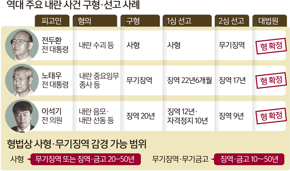 법조계에선 윤 전 대통령의 결심공판을 앞두고 내란 수괴(우두머리) 등 혐의로 기소됐던 전두환 전 대통령의 재판이 회자되고 있다. 검찰은 1996년 전 전 대통령의 내란 수괴, 내란 목적 살인 등 혐의 사건 1심 결심공판에서 사형을 구형했다. 당시 1심은 전 전 대통령에 대해 사형을 선고했으나, 2심에서 무기징역으로 감경된 뒤 대법원에서 그대로 형이 확정됐다.