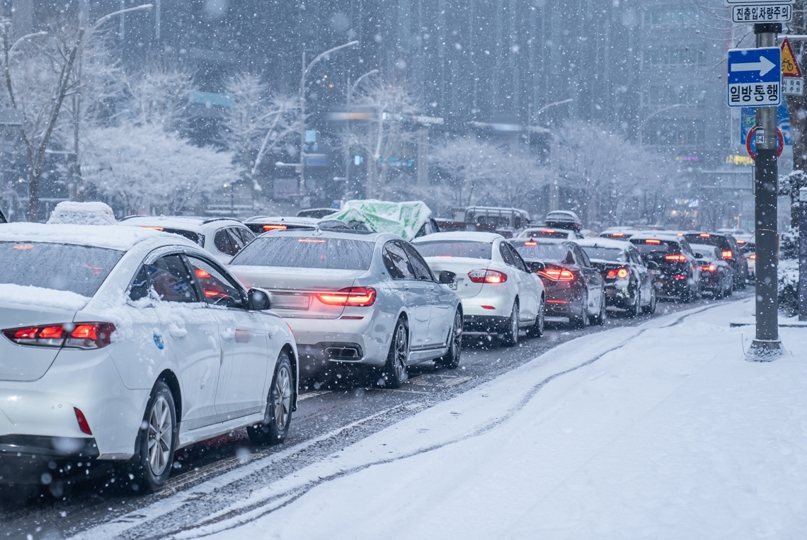 눈 내리는 도심 도로에서 차량들이 정체돼 있다. 게티이미지뱅크