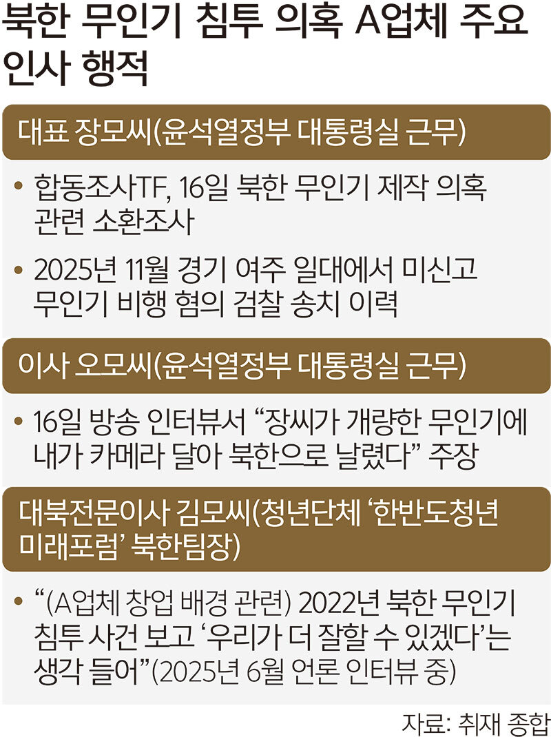 군경합동조사 태스크포스(TF)는 16일 장씨를 불러 조사했다. 같은 날 30대 대학원생이라고 밝힌 오씨는 언론 인터뷰를 통해 자신이 무인기를 날렸다고 자수했다.