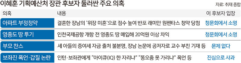 이혜훈 기획예산처 장관 후보자는 지난달 28일 지명 직후부터 이른바 ‘1일 1의혹’이라 불릴 만큼 각종 논란에 휩싸였다. 보좌진에 대한 폭언·갑질 의혹을 시작으로 아파트 부정청약, 부동산 투기, 이른바 ‘부모 찬스’ 논란까지 잇따라 제기되고 있다. 이 후보자는 “청문회에서 소명하겠다”며 일일이 해명했지만, 국민의힘은 “종합의혹 백화점”이라며 연일 공세를 이어가고 있다.