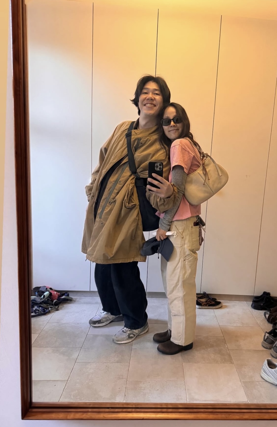 사진에는 현관 신발장 앞 거울을 배경으로 나란히 선 두 사람의 모습이 담겼다. 어깨를 맞댄 채 자연스럽게 포즈를 취하며 미소 짓는 부부의 모습은 편안한 분위기를 자아냈다.