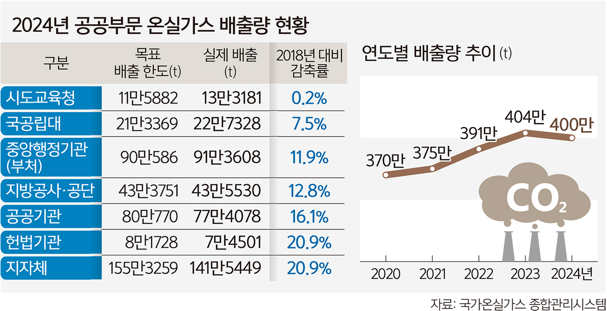 기관별 감축률을 보면 시도교육청이 0.2%로 가장 낮았고, 국공립대 7.5%, 정부 부처 11.9%, 지방공사·공단 12.8% 순으로 목표치(13.2%)를 밑돌았다. 특히 교육청의 부진이 두드러졌다. 시도교육청은 2024년 1만7623t의 온실가스를 줄여야 했지만 실제 감축량은 324t에 그쳤다.
