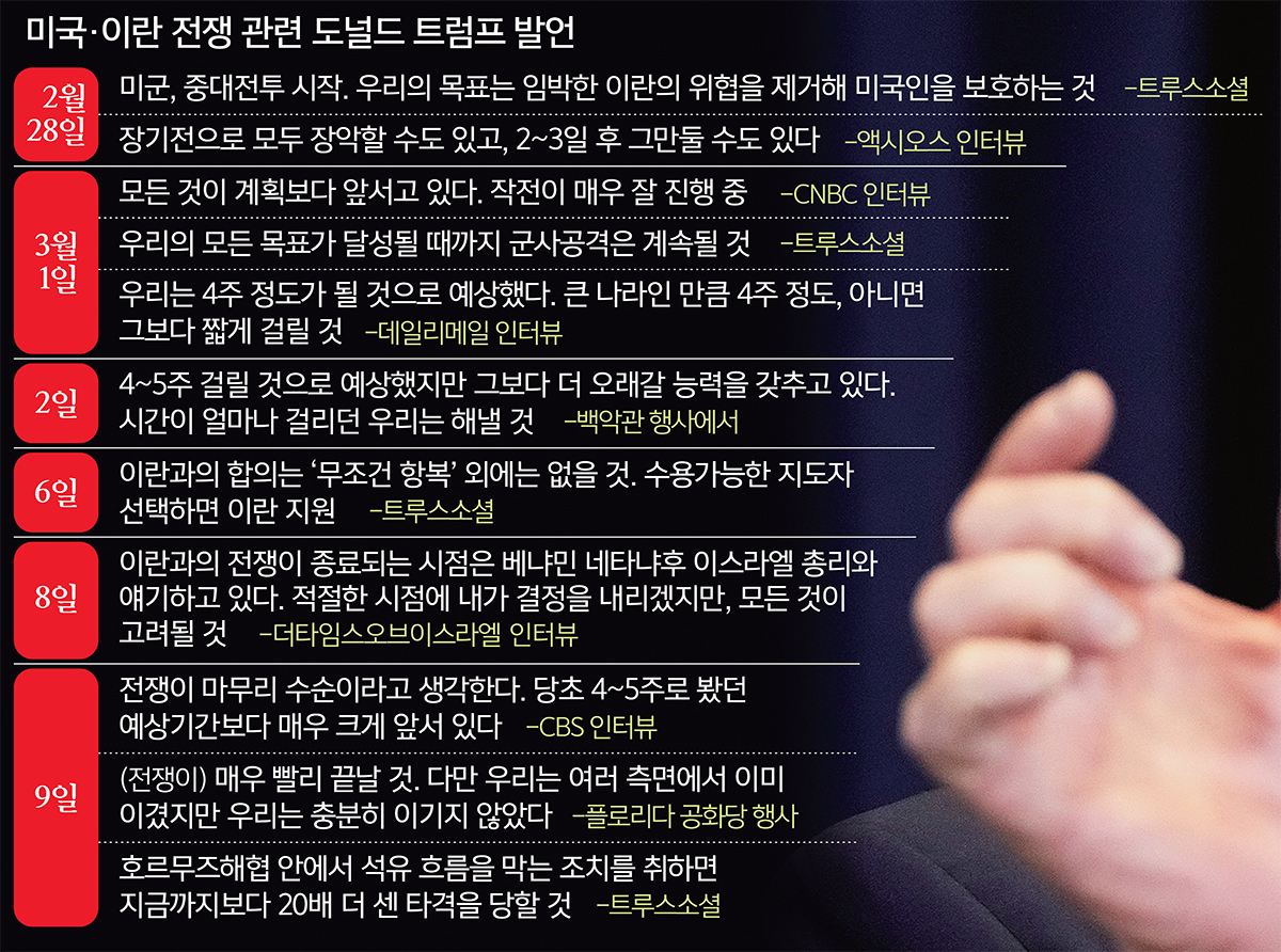 트럼프 대통령은 이날 플로리다주 도럴 리조트에서 열린 공화당 행사 이후 기자회견에서 “이란 전쟁이 곧 끝날 것”이라고 발언했지만 “우리는 여러 측면에서 이미 이겼지만 충분히 이기지 않았다”면서 추가적인 전쟁 지속 가능성을 언급하기도 했다. 심지어 기자회견 이후에도 자신의 사회관계망서비스(SNS)인 트루스소셜에 이란이 “호르무즈해협 안에서 석유 흐름을 막는 조치를 취하면 지금까지보다 20배 더 센 타격을 당할 것”이라고 추가 타격을 경고하기까지 했다.