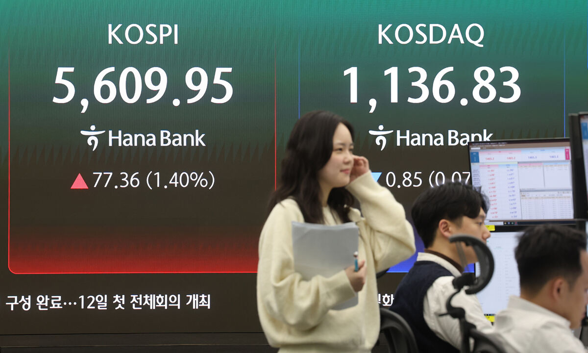 코스피가 1% 넘게 올라 5,600대로 마감한 11일 서울 중구 하나은행 딜링룸에서 직원들이 업무를 보고 있다. 이날 코스피는 전장보다 77.36포인트(1.40%) 오른 5,609.95에 장을 마쳤다. 연합뉴스