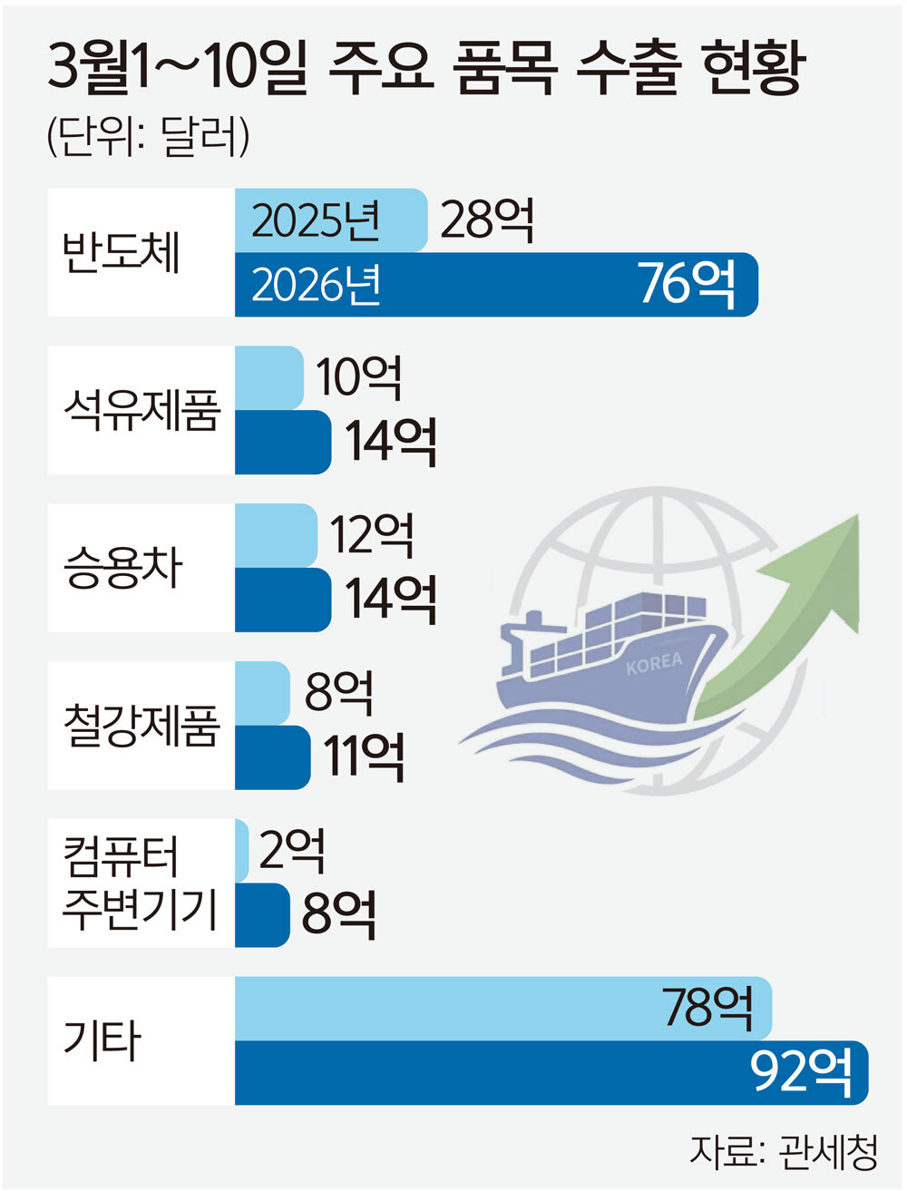 반도체 외에도 컴퓨터 주변기기(372.1%)와 석유제품(44.1%), 승용차(13.9%) 등 주력 품목 대부분의 수출액이 증가했다. 반면 선박(-61.9%)에서는 감소했다.