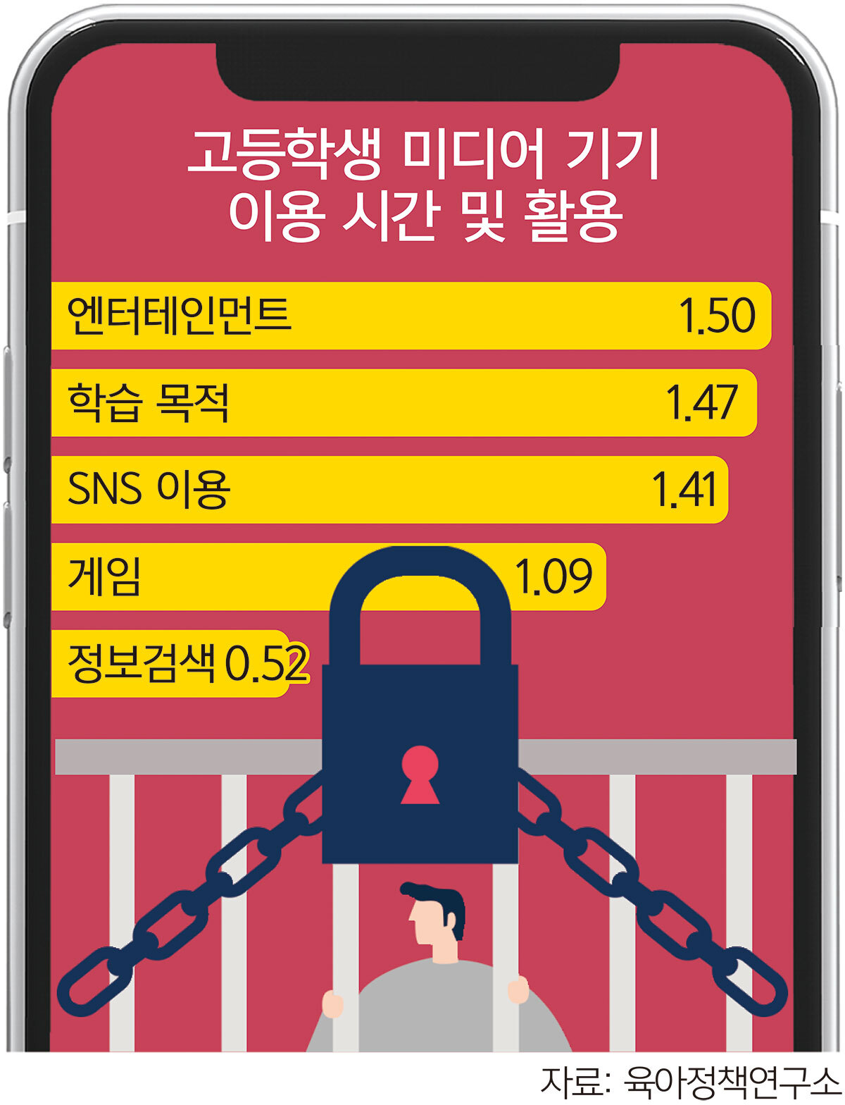 고등학생의 스마트폰 등 미디어 기기 일평균 사용 시간이 약 6시간으로 조사됐다. 학생 대부분은 이러한 이용 시간을 ‘정상 범주’로 여기지만, 학부모의 절반은 ‘자녀가 스마트폰 중독 고위험’이라고 생각하는 것으로 나타났다.