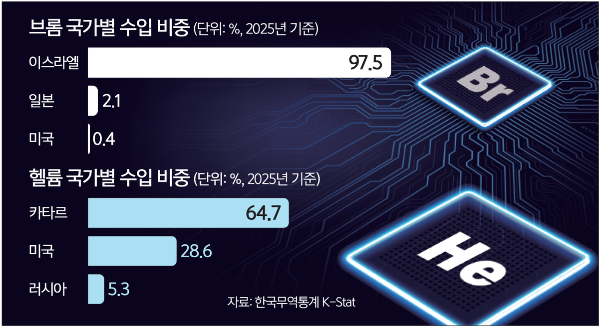 13일 한국무역협회에 따르면, 지난해 한국은 반도체와 디스플레이 제조 과정의 냉각재로 쓰이는 헬륨 수입량의 64.7%를 카타르에서 들여왔다. 난연제와 의약품, 반도체 등 광범위한 산업에 활용되는 브롬의 경우 97.5%를 이스라엘에서 수입했다. 원유와 나프타 못지않게 주요 산업의 필수 소재이면서 중동 의존도가 높은 것이다. 산업통상부 관계자는 통화에서 “브롬·헬륨 등의 경우 이미 3개월치 재고를 확보한 상태”라며 “특히 헬륨은 이번 중동 사태를 겪으며 일본과 미국 등 대체 공급망까지 확보한 만큼 당장에 큰 타격은 없을 것 같다”고 말했다.
