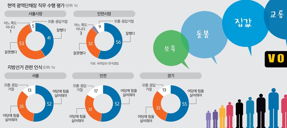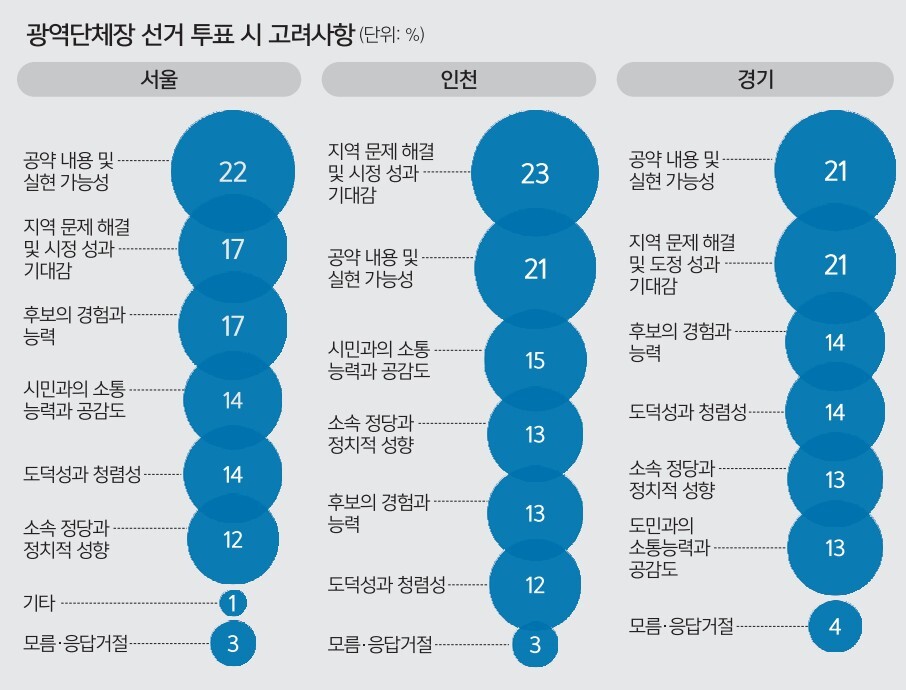 6·3 지방선거를 50일 앞두고 수도권 유권자는 공통적으로 ‘공약 내용 및 실현 가능성’과 ‘지역 문제 해결 및 시정 성과 기대감’을 가장 중요하게 보는 것으로 나타났다. 서울·경기·인천 모두 이번 지방선거에서 후보 공약을 평가할 때는 ‘공약 내용의 타당성과 실현 가능성’을 가장 고려하겠다고 답했다.