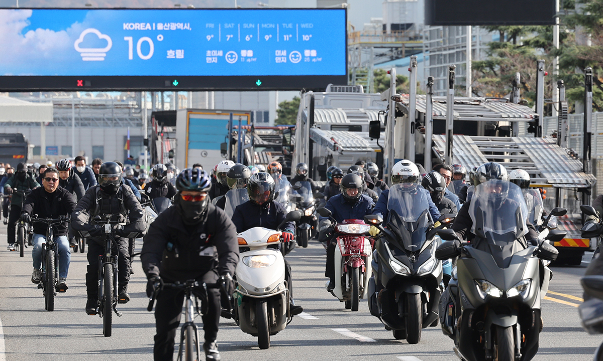 현대차 4시간 파업…퇴근하는 근로자들 (울산=연합뉴스) 김용태 기자 = 5일 오후 울산시 북구 현대자동차 명촌정문에서 오전조 근무자들이 2시간 일찍 퇴근하고 있다. 현대차 노조는 이날부터 이틀간 오전 근무조(1직)와 오후 근무조(2직)가 매일 2시간씩 총 4시간 파업을 결정했다고 밝혔다. 2024.12.5 yongtae@yna.co.kr/2024-12-05 14:29:08/ <저작권자 ⓒ 1980-2024 ㈜연합뉴스. 무단 전재 재배포 금지, AI 학습 및 활용 금지>