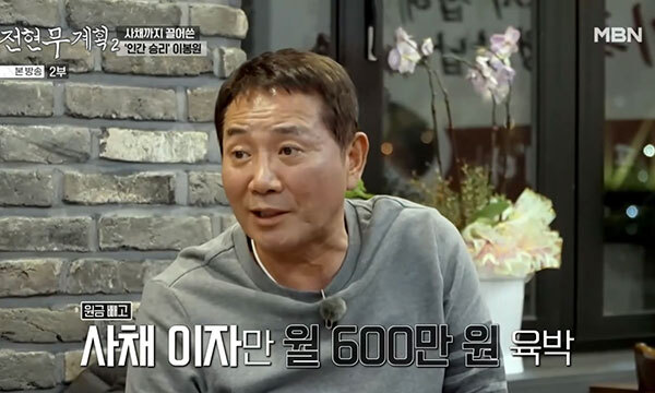 특히 "이자가 한 달에 월 600만 원씩 나갔다. 2푼(20%)이었다"고 했다. 전현무는 "20%면 살벌한 것"이라며 놀랐다.