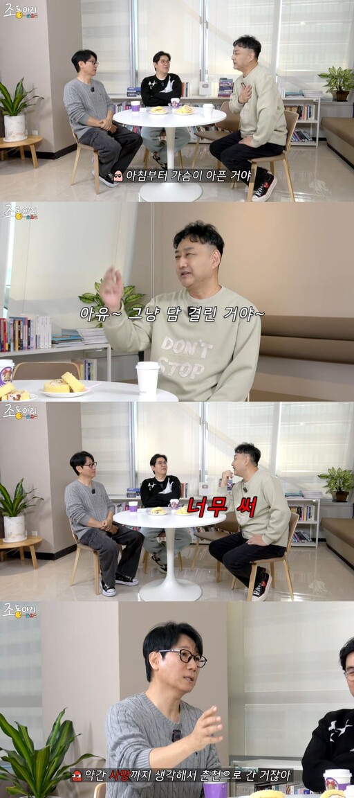 그는 "그냥 담 걸린 줄 알고 시원한 파스를 붙였다"며 "운전해서 (가평 촬영장으로) 가는데 가슴이 너무 아파서 운전을 못 할 것 같더라"라고 말했다.